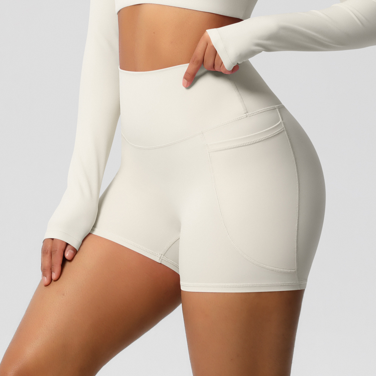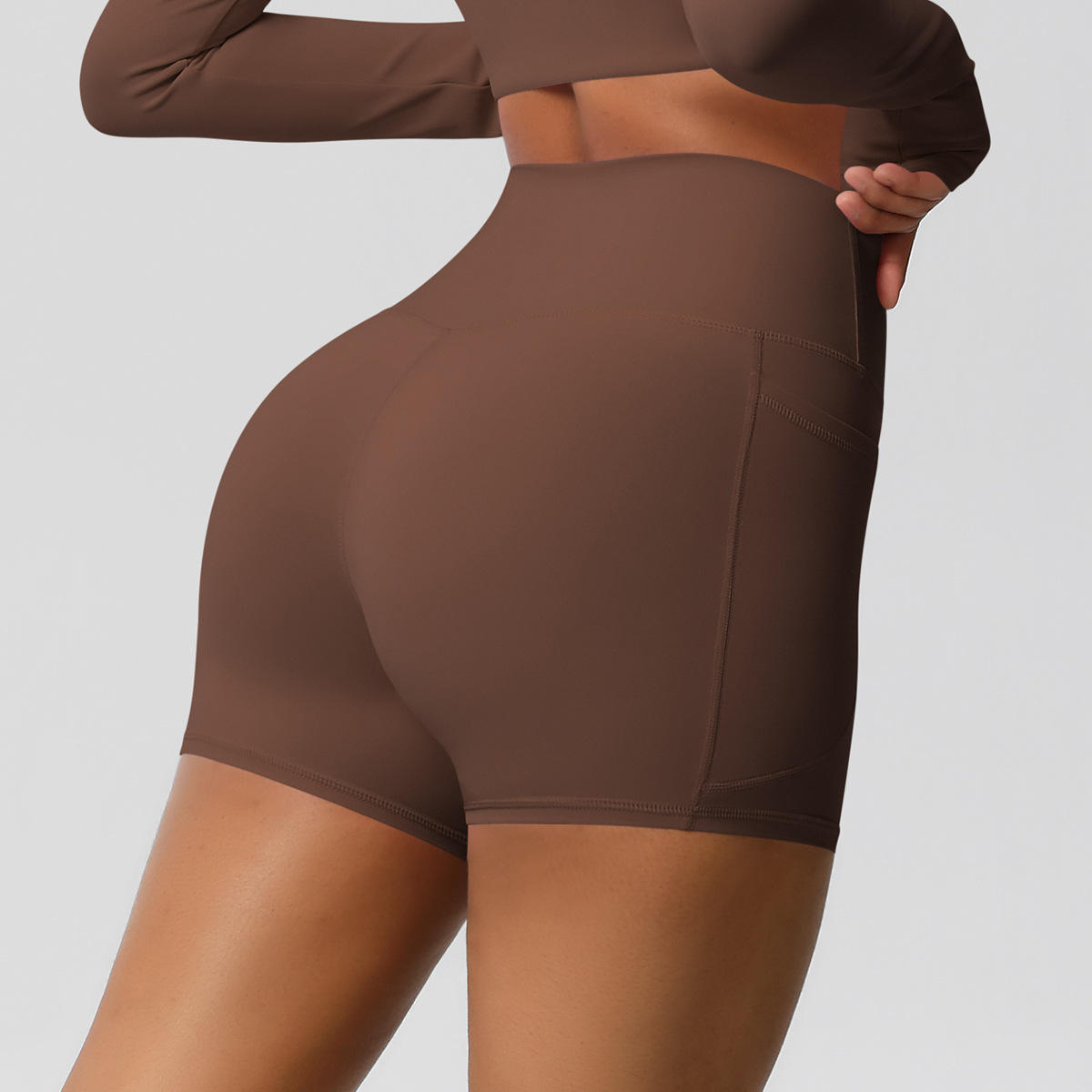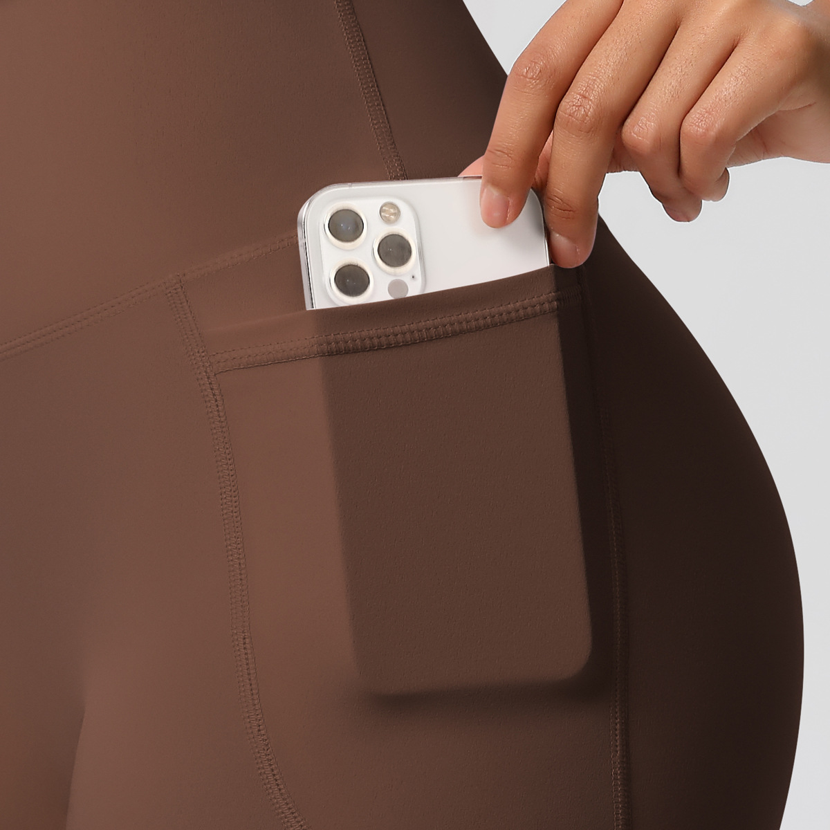 Shorts de ioga femininos com bolsos, modelo três-quartos, cor pêssego.