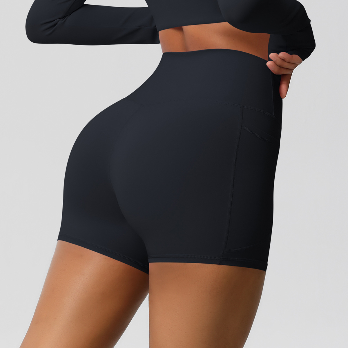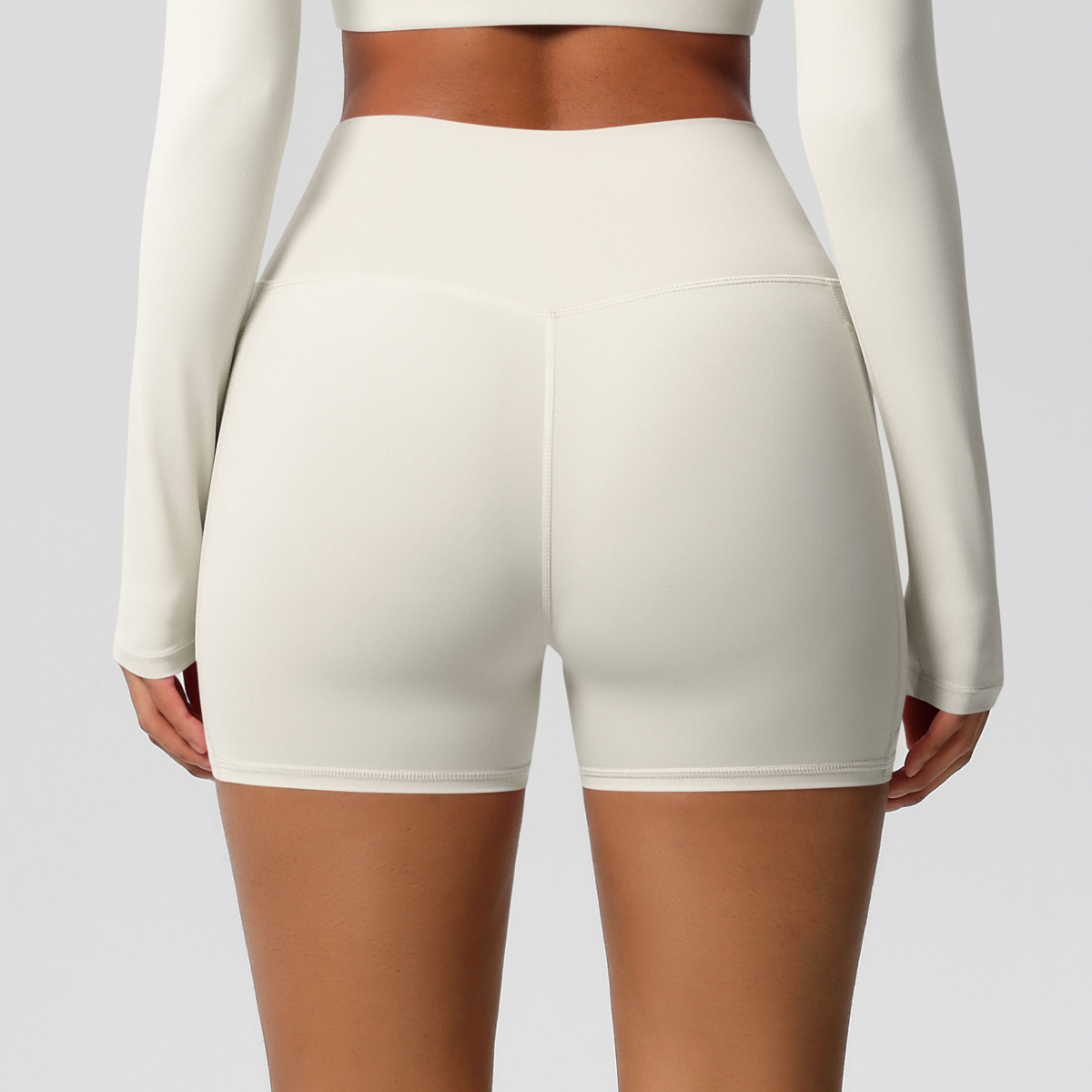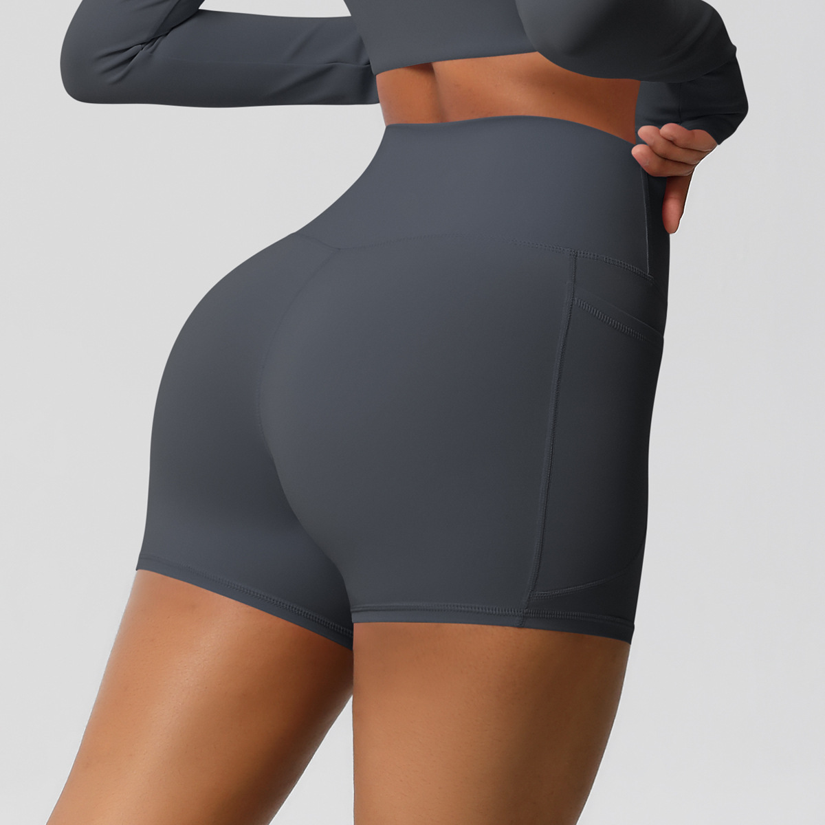 Shorts de ioga femininos com bolsos, modelo três-quartos, cor pêssego.